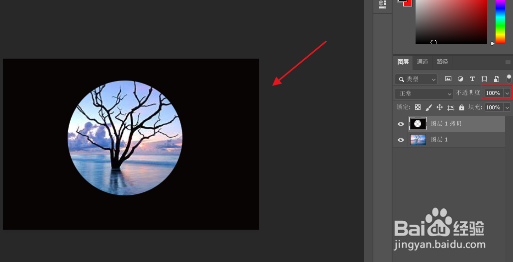 2、将复制的图层填充为黑色。然后降低不透明度并用椭圆选框工具,在裁剪圆形的位置上创建选区。