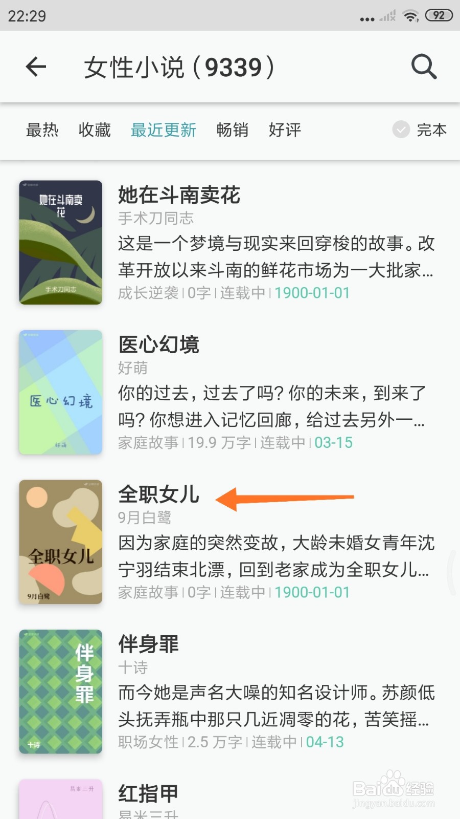 3、在打开的女性小说列表中,选择其中的全职女儿,即可进行查看。