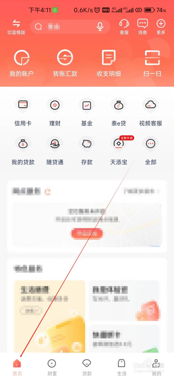 1、打开泰隆银行后,点击当前页面下方"首页"选项。