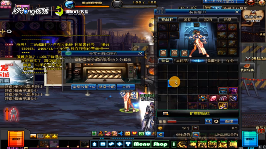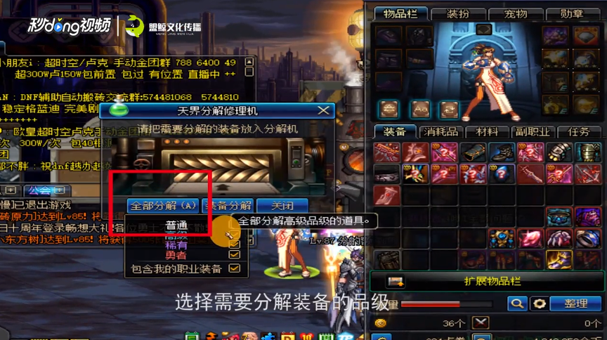 2、点击分解装备,打开左侧一栏,选择需要分解的装备的品级,点击确定即可完成全部分解。